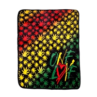 This Rasta colors One Love throw blanket is machine washable and covered in images of weed leaves in red, green, and gold/yellow. Air Dry. 100% Polyester that will keep you warm. Green with an image of a weed leaf.