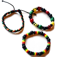 This set of 3 rasta, unisex, 1 size fits most bracelets, features 1 rasta braided bracelet, 1 rasta beaded bracelet, and 1 beaded bracelet that includes small rasta skulls.
