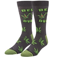 These grey men's crew socks feature the word's "Best Buds" and cartoon weed leaves.
