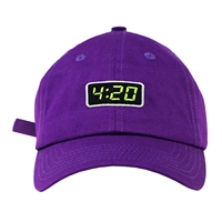 This 100% Cotton, 6 panel, low profile, super comfortable, purple dad hat features a fully adjustable strap metal buckle closure with tuck-in that fits most head sizes. The front features an embroidered 4:20 in a digital clock style and a small green cannabis leaf on the back.