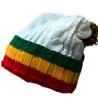 This 100% Acrylic crochet beanie cap features a rasta colored pom pom on top as well as a rasta stripe on the cuff that folds. This is a great head piece for those cold winter days.