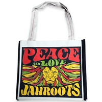 The cotton tote bag features a Peace and Love Lion of Judah logo. This tote bag is ideal for shopping as well as a fashion accessory for your music festival. It is strong enough to carry heavy items but will also fold up small and fit into a handbag or pocket.