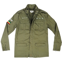 This Marley military jacket is olive green and made of a cotton twill material. The jacket has a Rasta patch and a 1945 patch on the right sleeve. A MARLEY patch and 3 triangle patches are on the front chest. There are 3 grommets on the back shoulder. The jacket has a rollout hidden hood, buttoned shoulder tabs, two buttoned-flap chest patch pockets, two flap waist pockets and a front zipper with a button closure. Made of 100% cotton.