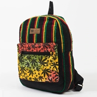 The backpack is funky and functional. It has a main zipper pocket with an open pocket inside and a zipper pocket in front, giving you plenty of room to fit all of your necessities. The fabric is thick and sturdy for long-lasting durability and security. Adjustable shoulder straps are padded for extra comfort as you travel. The vibrant Rasta stripes with a tie-dye leaf print are bright and unique, making this backpack stand apart from the rest.