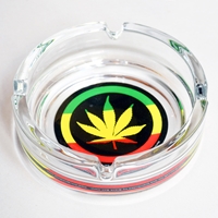 This 4.5" x 4.5" glass circle ashtray features a rasta colored base with a marijuana leaf in black.