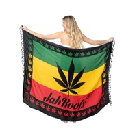 This sarong features a large marijuana leaf in the middle of the sarong, with a background of a rasta flag. Bordering the flag colors are smaller marijuana leaves.