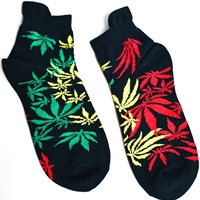 These 1 size fits most adult black, ankle, socks feature a pattern of cannabis leaves in rasta green, gold, red colors.