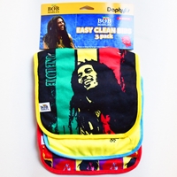 Bib 1: Bob Marleys face and a striped pattern of rasta colors, green, gold, red.