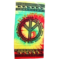 The rasta colored tie dye beach towel features a series of tribal patterns and a large peace sign.