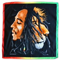 This 22" x 22" bandanna features Bob Marley's profile and the conquering lion of Judah's profiles pictured in the middle of the bandanna, with a Rasta colored border outlining the middle.