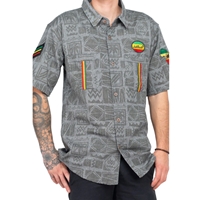 This short sleeve button down Rasta shirt is perfect for Rasta festivals and for any hot day. The print is a vintage 90's style with island reggae inspirations, with the occasional ganja leaf. Check the sleeves to see African and military style Rasta patches, and Rasta stripe trimmed pockets. The hem is a curved shirttail style that you can wear tucked or untucked.