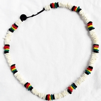 This unisex, one size fits all, necklace is composed of rasta and white colored shell fragments with a button slip knot closure.