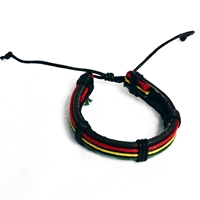 Shop our braided black leather bracelet wrapped with thin red, yellow, and green cords. It features a sliding knot closure for an adjustable fit. Style it with casual t-shirts, tank tops, denim jackets, shorts, or layered with other wristbands for a relaxed streetwear or beach look.