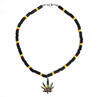 This necklace features cylinder black beads accented with round red, yellow, and green beads, finished with a metal marijuana leaf pendant. It includes a metal lobster clasp closure.