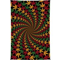 Shop our large Rasta cannabis leaf wall tapestry with a really striking visual effect. The design features red, yellow, and green cannabis leaves arranged in a tight spiral on a solid black background. This "vortex" pattern gives it a cool, tunnel-like look that really draws the eye.