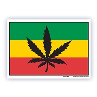 This rectangular sticker features a large, solid black silhouette of a cannabis leaf set against the background of the Rasta flag (horizontal stripes of green, yellow, and red).