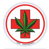 Shop our Medical Marijuana sticker! In the center, there is a bold, red medical-style cross. A detailed, bright green cannabis leaf is printed right on top of the cross, representing the medical cannabis movement.