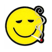 This patch has droopy, "stoned" eyes and is smiling while smoking a joint. White embroidered smoke curls up from the tip. The patch is die-cut, following the outline of the smiley face and the smoke, so it has a clean, custom shape.