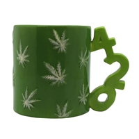 Here's a fun and unique coffee mug. The mug itself is a solid, glossy green, and it's covered in a pattern of embossed (raised) cannabis leaves. These leaves have a lighter, whitewashed finish, which makes them stand out from the green background.