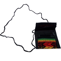 This small, convenient wallet is designed to be worn securely around your neck. It's made from a durable black fabric and features vibrant, woven Rasta-themed panels. The design includes both classic stripes (red, yellow, green) and intricate geometric patterns.