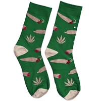 These crew socks feature a fun, all-over pattern perfect for any 420-friendly wardrobe. The background is a solid green and the pattern itself is repeated images of light-colored burning joints and matching cannabis leaves. The heel and toe areas are a soft light tan color. These socks are a comfortable crew length.