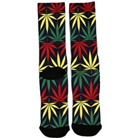 These crew socks feature an all-over Rasta-themed pattern. The entire body of the sock is covered in a vibrant repeating pattern of large cannabis leaves. The leaves alternate in Rasta colors: red, yellow, and green. This pattern is set against a dark background. The toe and heel areas are finished in solid black. These socks are a great, colorful way to add a Rasta/420-themed accessory to your collection.