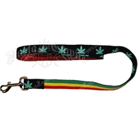 This Rasta Dog Leash is built to last and machine washable. The leash is the rasta colors of red, gold and green - on the reverse side is green marijuana leaves running along the leash with a black background. This leash has a steel quick snap clasp.