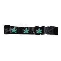 This Dog Collar is built to last and machine washable. The collar has green marijuana leaves running along the collar with a black background. The quick clasp is strong plastic and the collar has a steel D ring for attaching a leash.